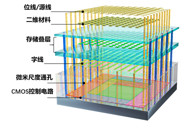 ![]() 二维-硅基混合架构闪存芯片结构示意图,包含二维模块、CMOS控制电路和微米尺度通孔 ![]() 二维-硅基混合架构闪存芯片光学显微镜照片 |