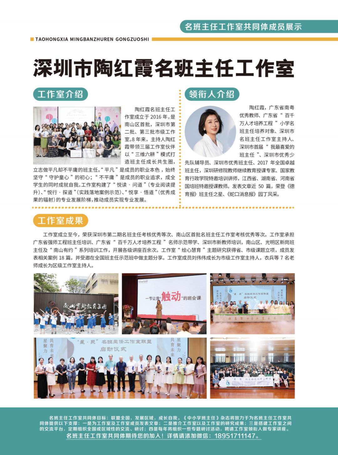 本期封面人物:陶红霞 广东省深圳市南山实验教育集团前海港湾学校高级教师。广东省南粤优秀教师,广东省 “百千万人才培养工程”小学名班主任培养对象, 深圳市第二、三届名班主任工作室主持人,深圳市首届“我最喜爱的班主任”,深圳市优秀少先队辅导员,深圳市优秀班主任,2017年全国卓越班主任。 深圳研修院教师继续教育授课专家,国家教育行政学院特邀培训讲师,江西省、湖南省、河南省国培班特邀授课教师。发表文章近50篇。 ![]() 封二:深圳市陶红霞名班主任工作室 ![]()